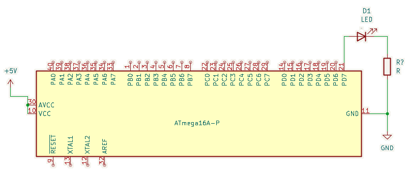 خیلی پیچیدش نمیکنیم، کلا یک مقاومت نیاز دارید با یک LED، پایه مثبت LED رو به پایه PD7 میکروکنترلرتون ( برای atmega16 پایه شماره ۲۱ ) متصل کنید و پایه منفی رو هم با مقاومت به GND متصل کنید.
