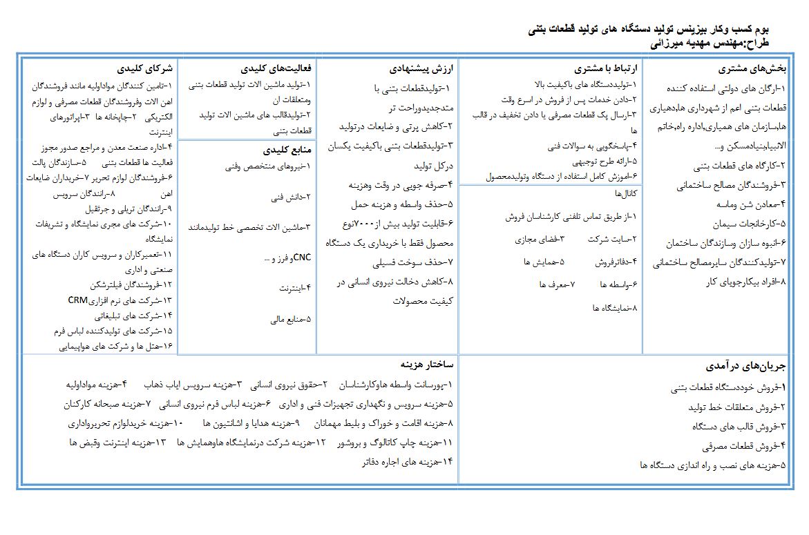 بوم کسبوکار (Business Model Canvas) یه ابزار تصویری و بسیار کاربردیست که کمک میکند مدل کسبوکار را بهصورت خلاصه، واضح و قابل فهم ترسیم کنیم. این ابزار توسط الکساندر استروالدر طراحی شده و شامل ۹ بخش اصلیست که در کنار هم تصویری کامل از منطق درآمدزایی کسبوکار به ما میدهد.این بوم کسبوکار کمک میکند مدل فعالیت برند را سریع تحلیل کنید، تصمیمات استراتژیک بگیرید، یا برای ارائه به سرمایهگذاران و ارگانهای دولتی آماده کنید
