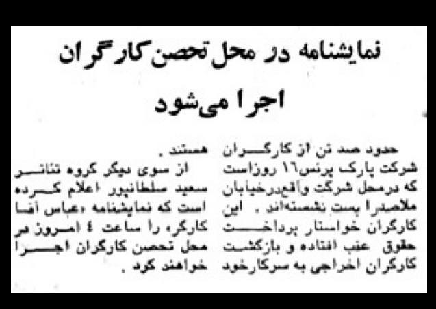 🔳 نمایش قرار بود در “هرجا که جا باشد” اجرا شود: خیابانها، پارکها، کارخانهها و… و هر روز در دانشگاه صنعتی (شریف). یکی از روزهای اردیبهشت ۱۳۵۸ من در همین سالن، نمایش را دیدم. تجربهای بود فراموشنشدنی که با حملۀ گروههای فشارِ آن روزگار متوقف شد و موجب دردسرِ اغلب کسانی که در اجرای آن نمایش سهیم بودند؛ از جمله خودِ عباس صالحی. سعید سلطانپور، انقلابیِ پرشور هم حدود دوسال بعد در سن ۴۱ سالگی قربانیِ شرایطِ آن دوران شد و در زندان اوین تیربارانش کردند.