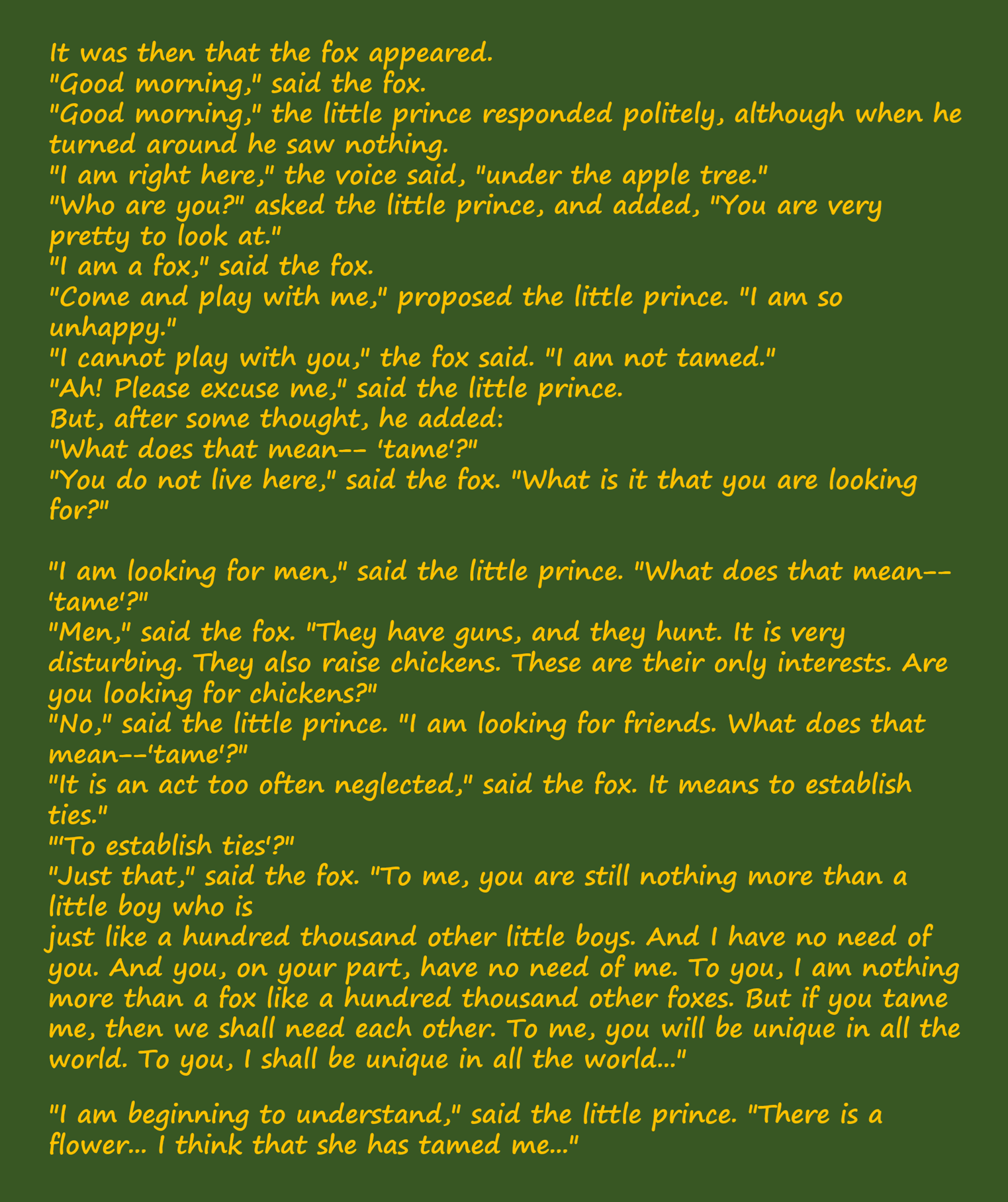 روباه گفت: «همین.» «برای من، تو هنوز چیزی بیش از یک پسر بچه نیستی که درست مثل صد هزار پسر بچه دیگر است. و من به تو نیازی ندارم. و تو هم از طرف خودت، به من نیازی نداری. برای تو، من چیزی بیش از یک روباه نیستم مثل صد هزار روباه دیگر. اما اگر مرا اهلی کنی، به هم نیاز خواهیم داشت. برای من، تو در تمام دنیا بینظیر خواهی بود. برای تو، من در تمام دنیا بینظیر خواهم بود...»
