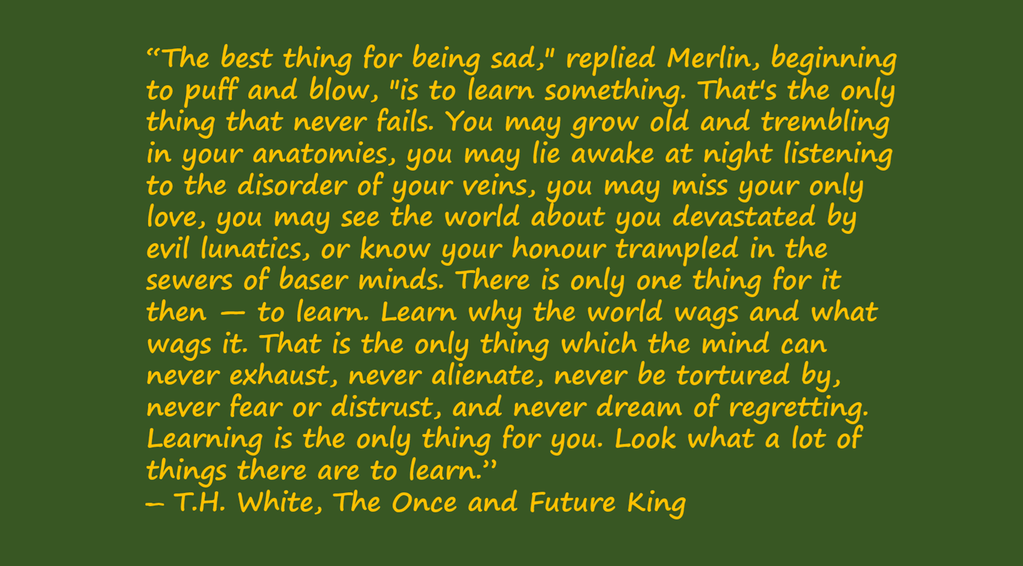 مرلین در حالی که شروع به پک زدن و فوت کردن میکرد، پاسخ داد: «بهترین چیز برای غمگین بودن، یادگیری چیزی است. این تنها چیزی است که هرگز از دست نمیرود. ممکن است پیر شوی و در کالبدت بلرزی، ممکن است شبها بیدار بمانی و به لرزش رگهایت گوش دهی، ممکن است دلتنگ تنها عشقت شوی، ممکن است دنیای اطرافت را ویران شده توسط دیوانگان شیطانی ببینی، یا بدانی که شرافتت در فاضلاب ذهنهای پستتر پایمال شده است. پس فقط یک چیز برای آن وجود دارد - یادگیری. یاد بگیر که چرا دنیا میجنبد و چه چیزی آن را میجنباند. این تنها چیزی است که ذهن هرگز نمیتواند از آن خسته شود، هرگز بیگانه نشود، هرگز شکنجه نشود، هرگز نترسد یا بیاعتماد نشود و هرگز رویای پشیمانی را در سر نپروراند. یادگیری تنها چیز برای توست. ببین چه چیزهای زیادی برای یادگیری وجود دارد.»