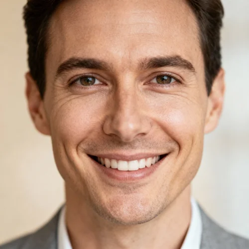 پرامپت پیشنهادی ChatGPT: "یک پرتره کلوزآپ از یک فرد (مرد/زن) با لبخندی دوستانه و چشمان نافذ که اعتماد به نفس را نشان میدهد. پسزمینه محو و مینیمال با رنگهای گرم و آرامشبخش (مانند بژ یا خاکستری روشن). نورپردازی ملایم و یکنواخت از جلو که سایههای تند را از بین میبرد و ویژگیهای صورت را برجسته میکند. لباسهای هوشمند و نیمه رسمی. سبک: عکاسی پرتره استودیویی."