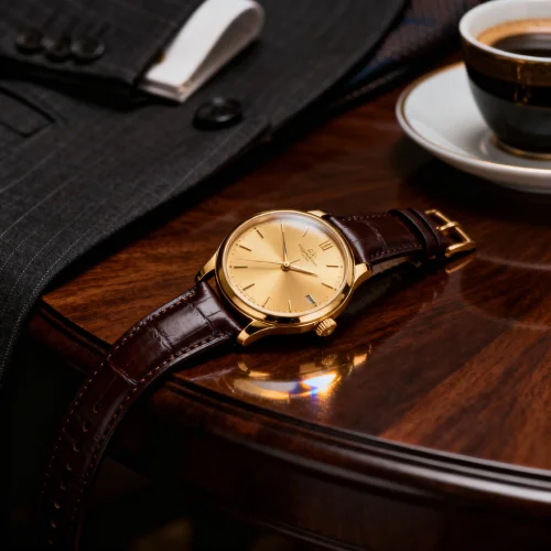 پرامپت پیشنهادی ChatGPT: "یک ساعت مچی لوکس با بند چرمی قهوهای تیره و قاب طلایی، که به آرامی روی یک میز چوبی صیقلی قرار گرفته است. در پسزمینه، قسمتی از یک کت و شلوار گرانقیمت مردانه و فنجان قهوه اسپرسو دیده میشود. نورپردازی دراماتیک از بالا، که بازتابهای ظریفی روی صفحه ساعت ایجاد میکند. حس کلی: لوکس، ثروتمندانه، کلاسیک و نشاندهنده دقت و نظم. سبک: عکاسی محصول حرفهای."