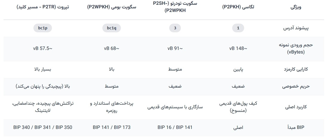 با این ارتقاها، انواع مختلفی از «برچسبهای پستی» یا فرمتهای آدرس در شبکه بیتکوین به وجود آمدند. انتخاب برچسب درست، تأثیر مستقیمی بر هزینه و کارایی ارسال بسته شما دارد: