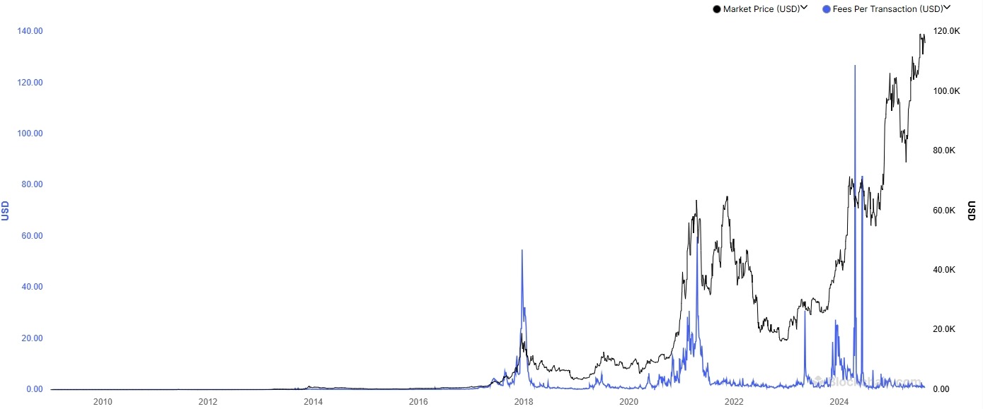 خط آبی (Fees Per Transaction - کارمزد به ازای هر تراکنش): این خط میانگین کارمزد هر تراکنش در شبکه بیتکوین را به دلار آمریکا نشان میدهد. مقیاس آن در محور عمودی سمت چپ است.