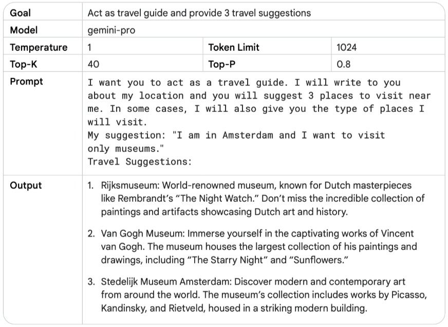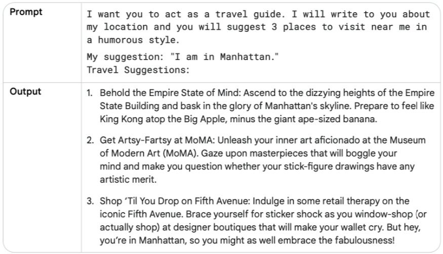 میتوانید به مدل هوش مصنوعی نقش یک ویراستار کتاب، یک معلم مهدکودک، یا یک سخنران انگیزشی را بدهید. وقتی نقش مدل مشخص شد، میتوانید درخواستهایی به او بدهید که مختص همان نقش باشند. مثال زیر نمونهای از ایفای نقش یک کارمند آژانس مسافرتی توسط مدل هوش مصنوعی را نشان میدهد. اگر شما همین نقش را به «معلم جغرافیا» تغییر دهید، متوجه خواهید شد که پاسخ کاملاً متفاوتی دریافت میکنید.