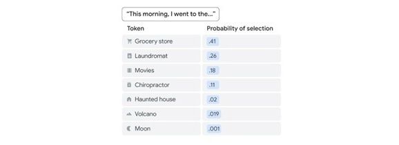برای روشنتر شدن این مفهوم، دوباره به جمله مثال برگردیم: «This morning, I went to the». بر اساس تحلیل حجم زیادی از متنها، ابزار هوش مصنوعی احتمالات کلمات بعدی را به این شکل تعیین کرده است: