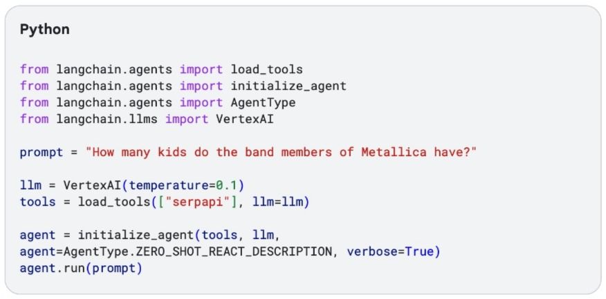 برای دیدن این روش در عمل، باید کدی بنویسید. در قطعه کد شماره 1، در اینجا از فریمورک LangChain در زبان پایتون به همراه VertexAI (از بسته google-cloud-aiplatform) و بسته google-search-results استفاده شده.
