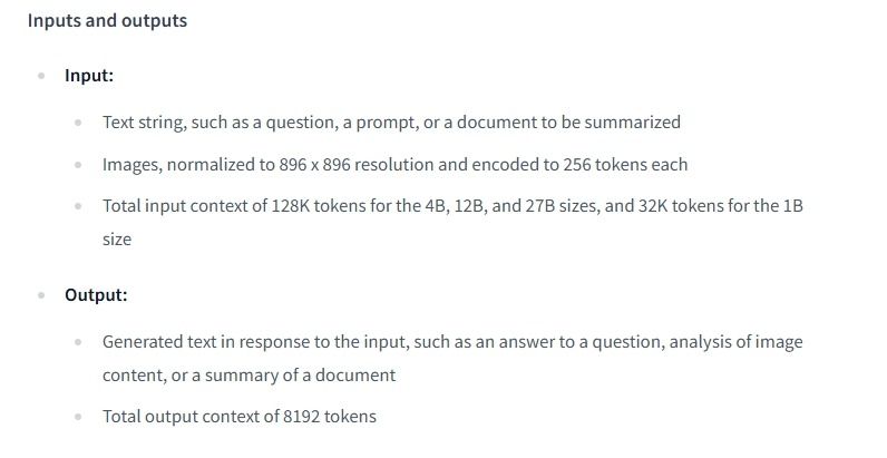 در قسمتی از متن به حداکثر تعداد توکنهایی که مدل جما ۲۷ بیلیون پارامتر میتواند به عنوان ورودی (Total input context) بگیرد، بدون در نظر گرفتن خروجی ۱۲۸ هزار توکن است و در مقابل خروجی (Total output context) آن محدود به ۸۱۹۲ توکن می باشد.