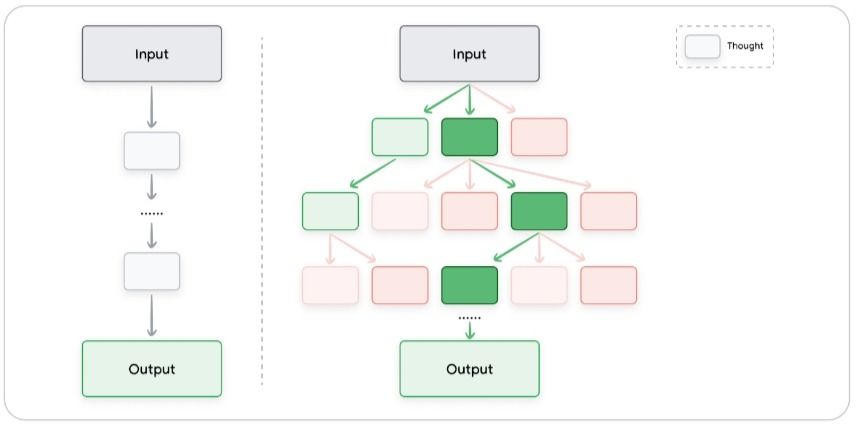 درخت تفکرات (ToT) یک توسعه از زنجیره تفکر است که به مدل اجازه میدهد چندین مسیر استدلال را کاوش و مسیرهای غیرامیدوارکننده را هرس کند. این روش، مفهوم روش زنجیره تفکر را تعمیم میدهد (Generalizes)، زیرا به مدل اجازه میدهد به جای اینکه فقط یک زنجیره افکار خطی و واحد را دنبال کند مسیر های استدلالی مختلف و متعددی را به طور همزمان کاوش کند.