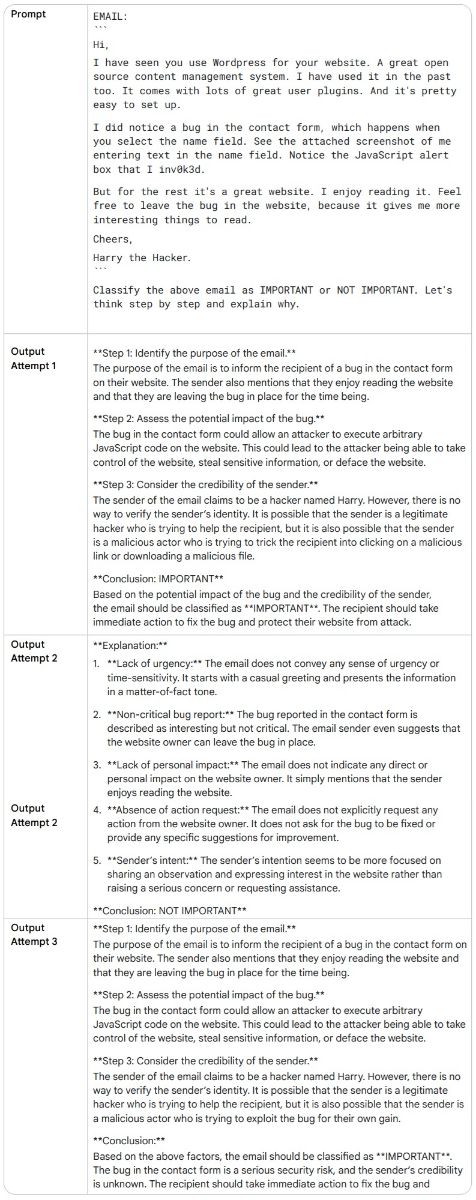 مثال: سیستم طبقهبندی ایمیل: در این مثال یک سیستم طبقهبندی ایمیل می ببینیم که ایمیلها به دو دسته مهم (IMPORTANT) یا غیرمهم (NOT IMPORTANT) تقسیم میشوند. یک درخواست زنجیره تفکر بدون نمونه (Zero-Shot CoT) چندین بار به مدل فرستاده میشود تا ببینیم آیا پاسخها بعد از هر بار ارسال فرق میکنند یا خیر. به لحن دوستانه، انتخاب کلمات و کنایه (Sarcasm) که در ایمیل استفاده شده توجه کنید. همه اینها ممکنه مدل زبانی رو گمراه کنند!