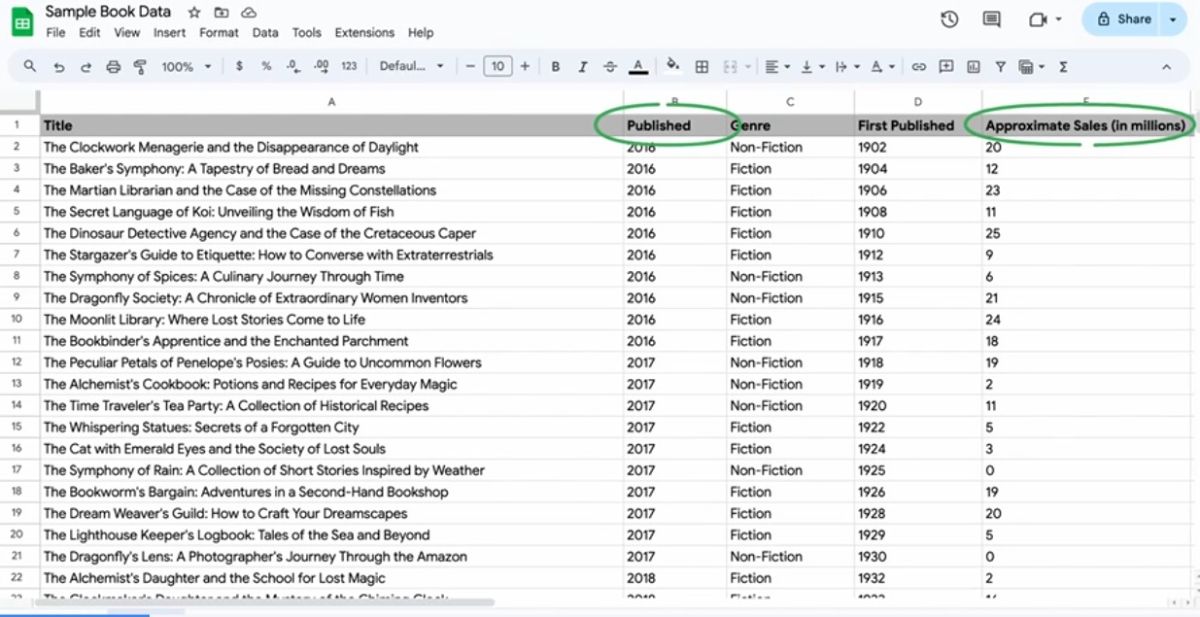 Context: My dataset is a spreadsheet that uses the following columns: "Title," "Published," "Genre," "First published," and "Approximate sales (in millions)"