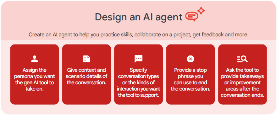 برای ساخت یک نماینده (Agent)، باید ابزار هوش مصنوعی مولد را مانند همیشه از طریق ارائه پرامپت هدایت کنید، اما این بار تمرکز بیشتری بر شخصیت(Persona) و زمینه (Context) خواهید داشت. هر چه جزئیات بیشتری دربارهی کاری که میخواهدی نماینده انجام دهید و نحوهی پاسخدهی آن ارائه کنید، نتیجه مؤثرتر خواهد بود.در اینجا نحوه طراحی یک نماینده هوش مصنوعی آورده شده است: