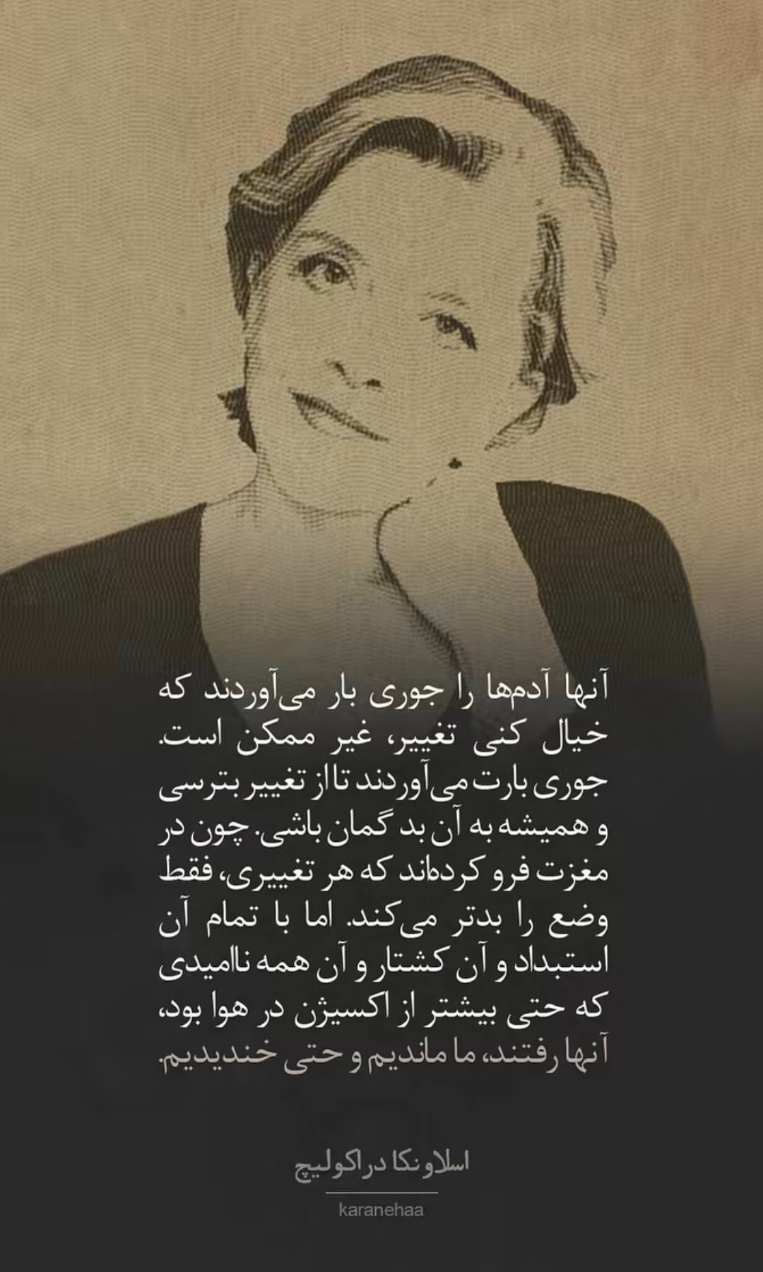 میدونی سالهاست زندگیم این رو نشون داده که گاهی برکات خداوند با شکستن پنجره ها وارد میشه. چرا؟ چون حجمش بزرگه شدتش زیاده مقاوت نکن. جلوش و نگیر بذار بشکنه، فضا بزرگتر بشه، میخواد به همون اندازه بهت بده؛ پس اگه قراره سقوط کنی، بذار بری چون اون که تو رو میگیره کیه؟ ....