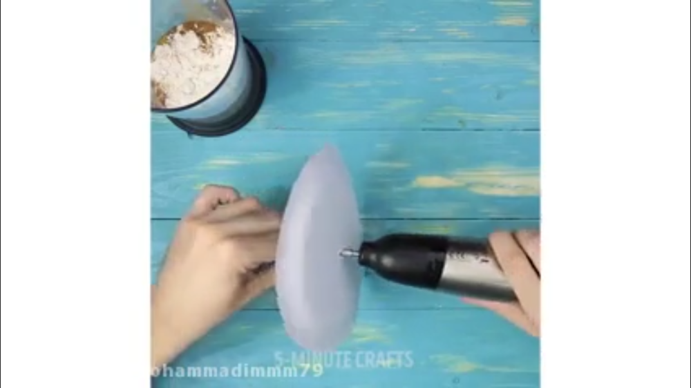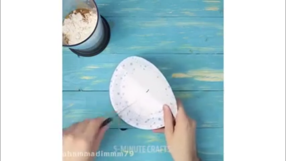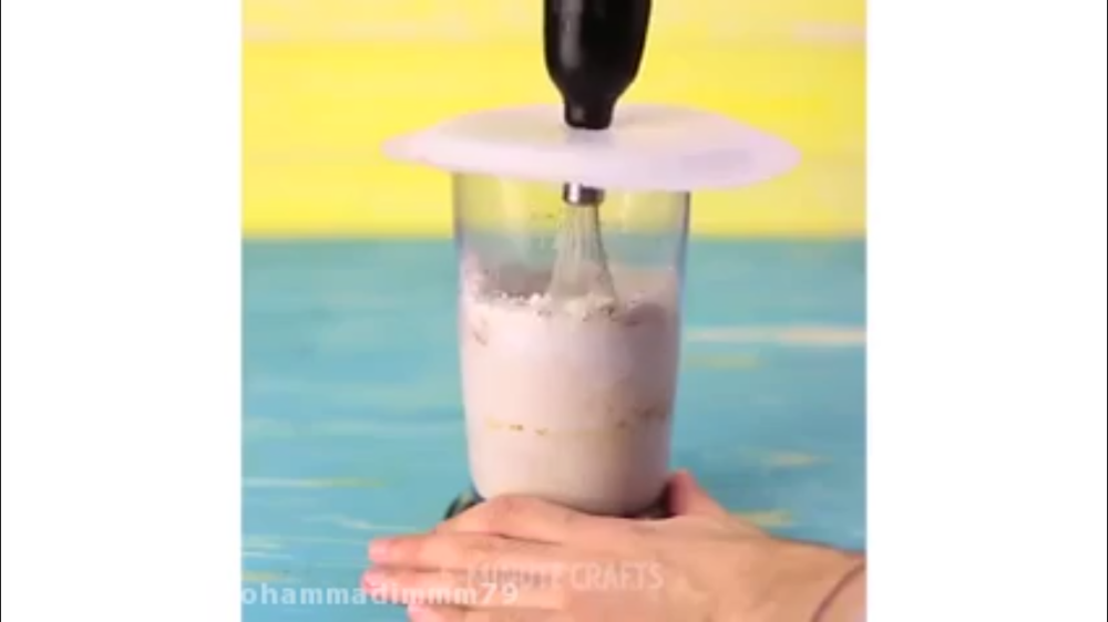 وسط یک بشقاب پلاستیکی یا همون بشقاب های جشن تولد را با چاقو سوراخ کنید بعد همزن رو به اون وصل کنید