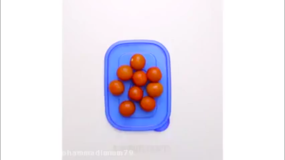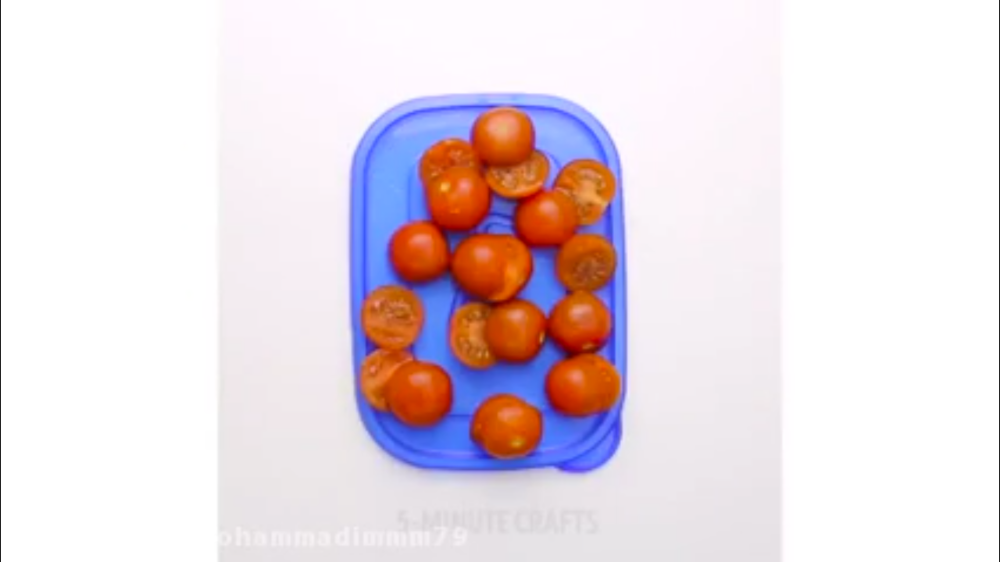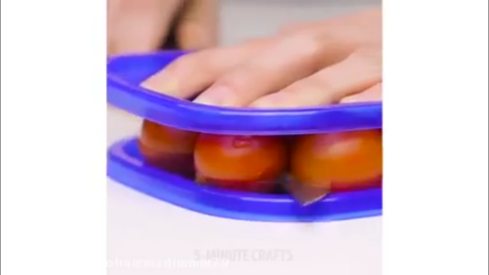 گوجه های گیلاسی رو اگر می خواید نصف کنید: آنها را روی یک دَر ظرف قرار بدید و بعد یک دَر دیگه روش بزارید.