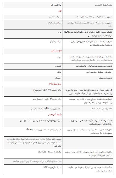 در جدول زیر انواع منابع آلایندۀ هوا و راههای تولید آنها آورده شده است: