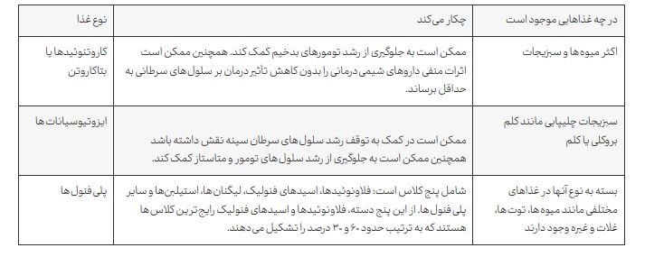خوردن غذاهای حاوی ترکیبات خاصی به نام فیتوشیمیکال ممکن است به بدن شما کمک کند تا با سرطان مبارزه کند. این مواد شیمیایی عمدتاً در غذاهای گیاهی وجود دارند. اما، یک نکتۀ احتیاطی: برخی مطالعات نشان میدهند که این ترکیبات ممکن است به کاهش خطر یا عود سرطان کمک کنند، اما برای تعیین تأثیر دقیق این ترکیبات بر سرطانهای موجود در مقایسه با خطر سرطان، تحقیقات بیشتری مورد نیاز است.