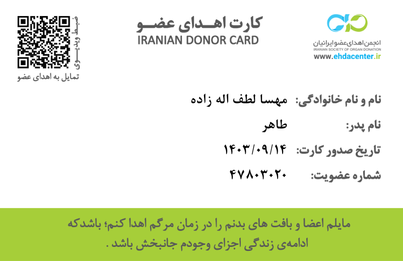 این دومین کارت عضویه که من گرفتم، دفعه اول چند سال پیش بود که چون زیر سن قانونی بودم و سیم کارت به نام خودم نداشتم نشد ثبت نامم رو تکمیل کنم. دفعه دوم نزدیک تولد امسالم بود که گفتم یک کار معنوی خداپسندانه انجام بدم و کارتم رو ثبت کردم، البته هنوز به صورت فیزیکی دریافتش نکردم.