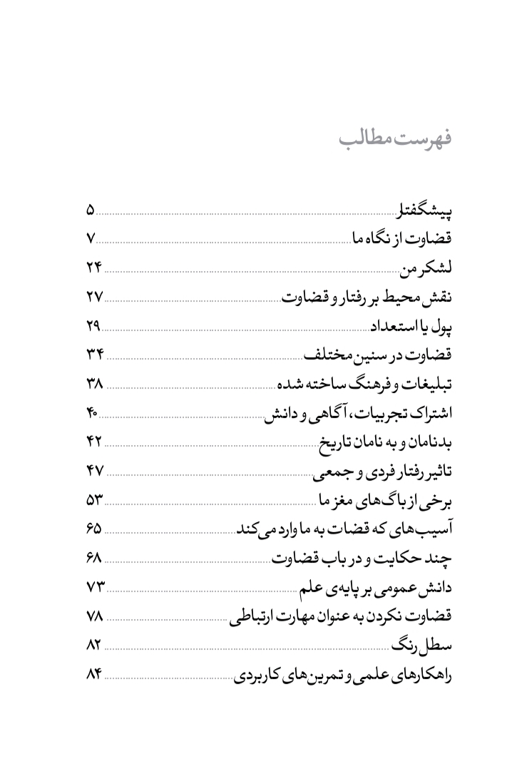 در این کتاب سعی شده با مثالهای ساده و نقل قولهای فراوان و همچنین تحقیقات و مطالب علمی ...مسئله ی قضاوت را به شکلی قابل درک برای همه ی سنین به زبانی بازگو کند که کمک شایانی در زندگی،روابط و افکار ما نسبت به دیگران داشته باشد