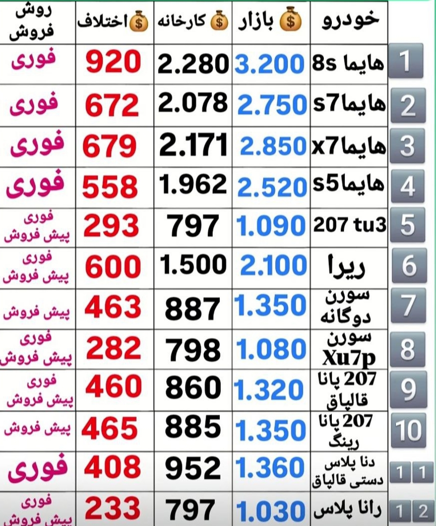 بر اساس جدول ارائهشده در تصویر دوم، اختلاف قیمت برخی خودروها به صدها میلیون تومان میرسد. این اختلاف، دلیل اصلی جذابیت ثبت نام جدید ایران خودرو است.