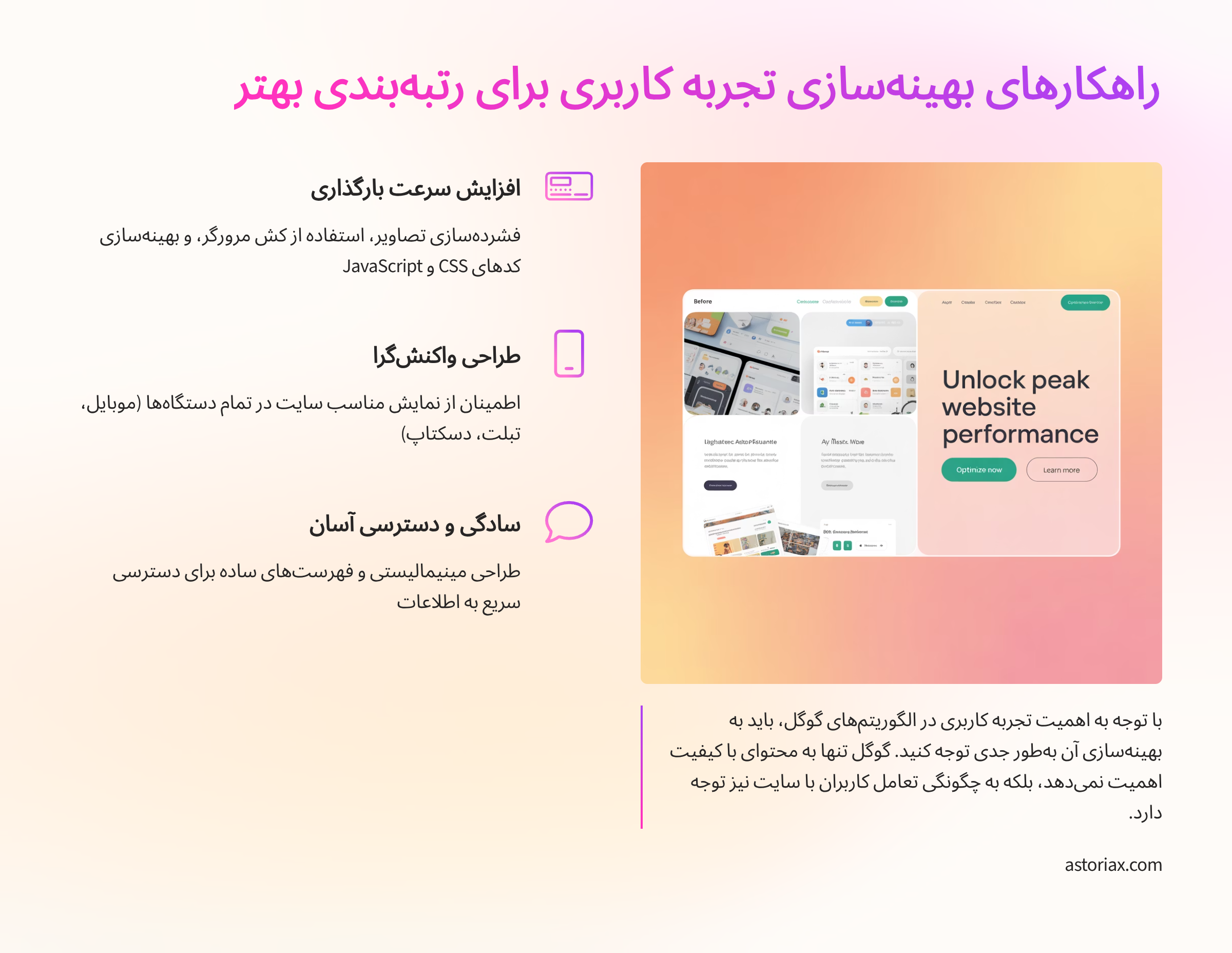 با توجه به اهمیت تجربه کاربری (UX) در الگوریتمهای گوگل، باید به بهینهسازی آن بهطور جدی توجه کنید. گوگل تنها به محتوای با کیفیت اهمیت نمیدهد، بلکه به چگونگی تعامل کاربران با سایت نیز توجه دارد. بهینهسازی سرعت بارگذاری، طراحی واکنشگرا، سادگی در دسترسی به اطلاعات، و استفاده بهینه از محتوای چندرسانهای از جمله اقداماتی است که میتواند تجربه کاربری سایت شما را بهبود بخشد و در نتیجه، رتبه شما را در نتایج جستجوی گوگل ارتقا دهد.
