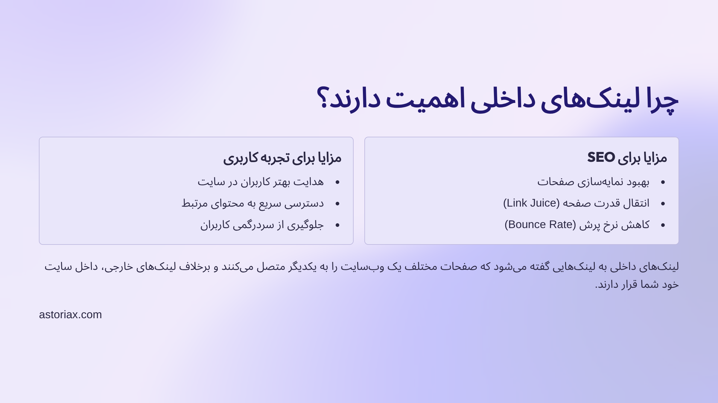 لینکهای داخلی باعث میشوند که کاربر به راحتی در سایت جابجا شود و مطالب بیشتری را پیدا کند. لینکهای خارجی از سایتهای معتبر میتوانند به موتور جستجو سیگنال دهند که محتوای شما ارزشمند و قابل اعتماد است.