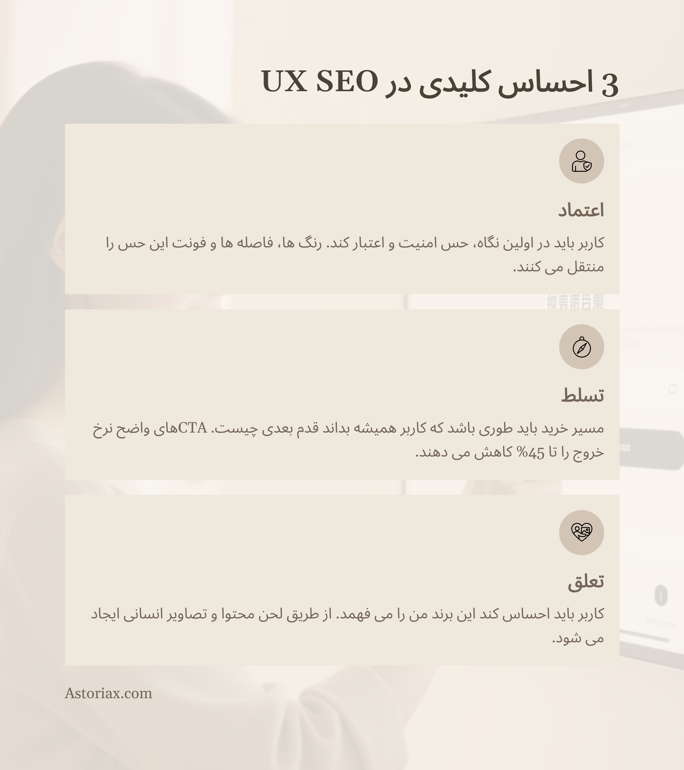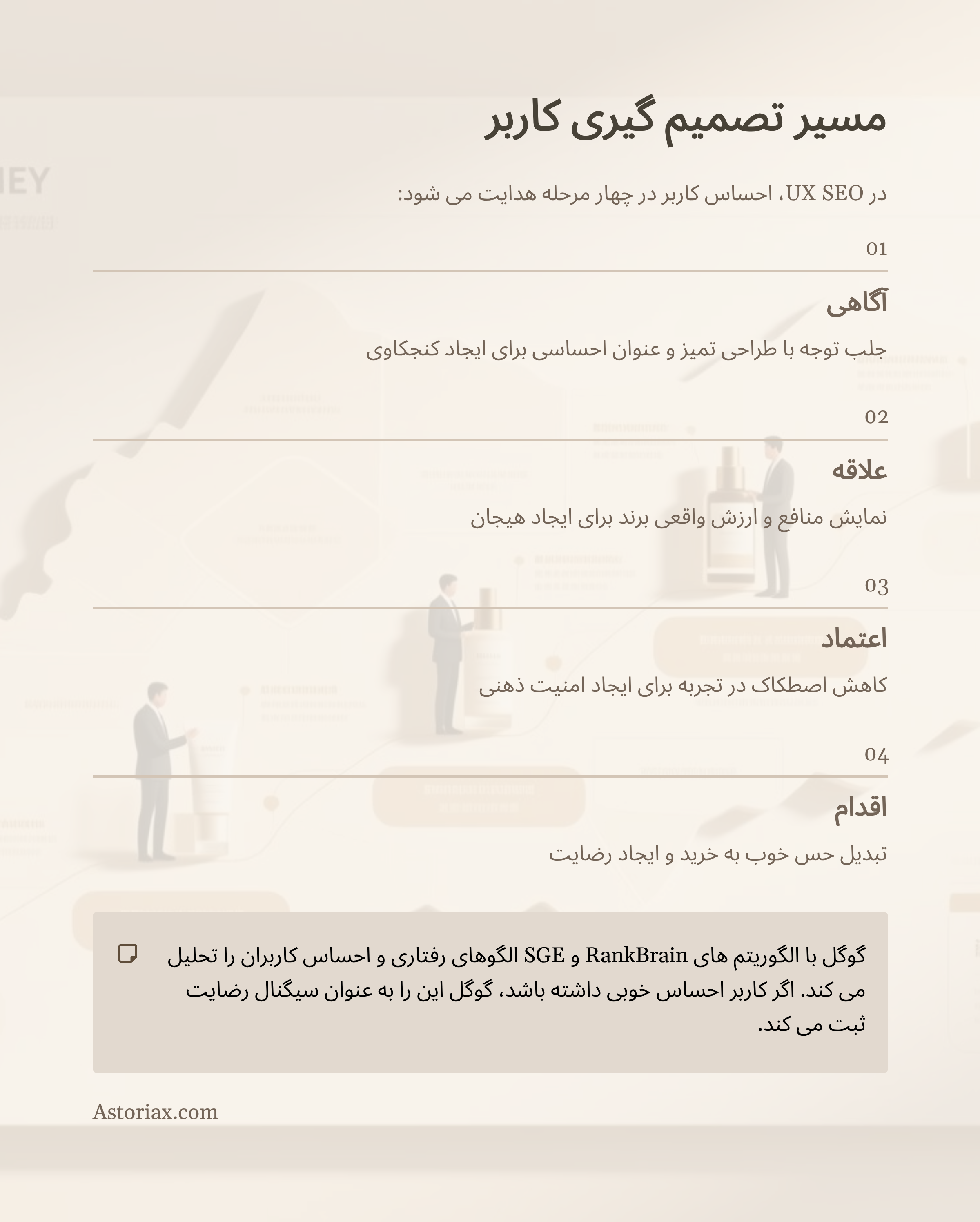 مرحلهاحساس غالبهدف UX SEOآگاهی (Awareness)کنجکاویجلب توجه با طراحی تمیز و عنوان احساسیعلاقه (Interest)هیجاننمایش منافع و ارزش واقعی برنداعتماد (Trust)امنیت ذهنیکاهش اصطکاک در تجربهاقدام (Action)رضایتتبدیل حس خوب به خرید