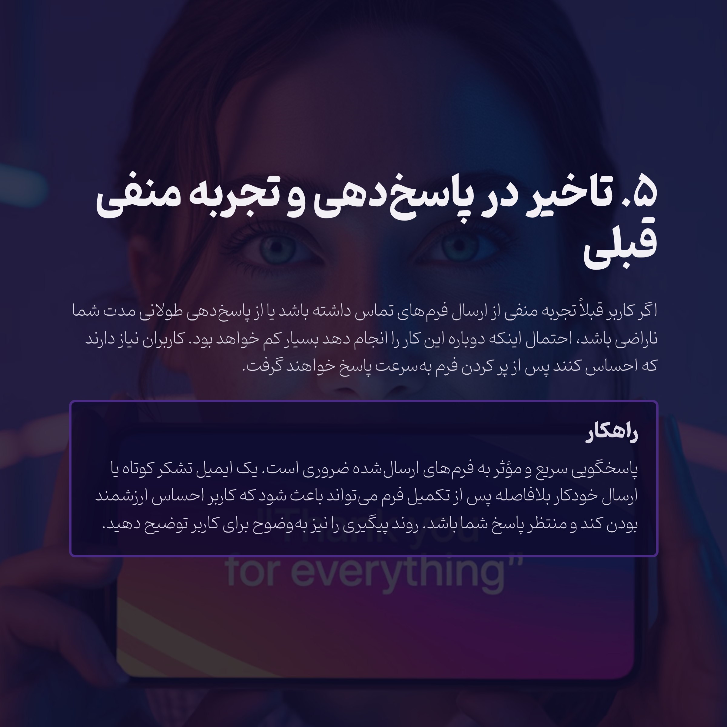 راهکار: پاسخگویی سریع و مؤثر به فرمهای ارسالشده میتواند این شکاف را پر کند. یک ایمیل تشکر کوتاه یا ارسال خودکار بلافاصله پس از تکمیل فرم میتواند باعث شود که کاربر احساس ارزشمند بودن کند و منتظر پاسخ شما باشد. همچنین، اگر فرم شما نیاز به پیگیری داشته باشد، باید روند پیگیری را بهوضوح برای کاربر توضیح دهید.