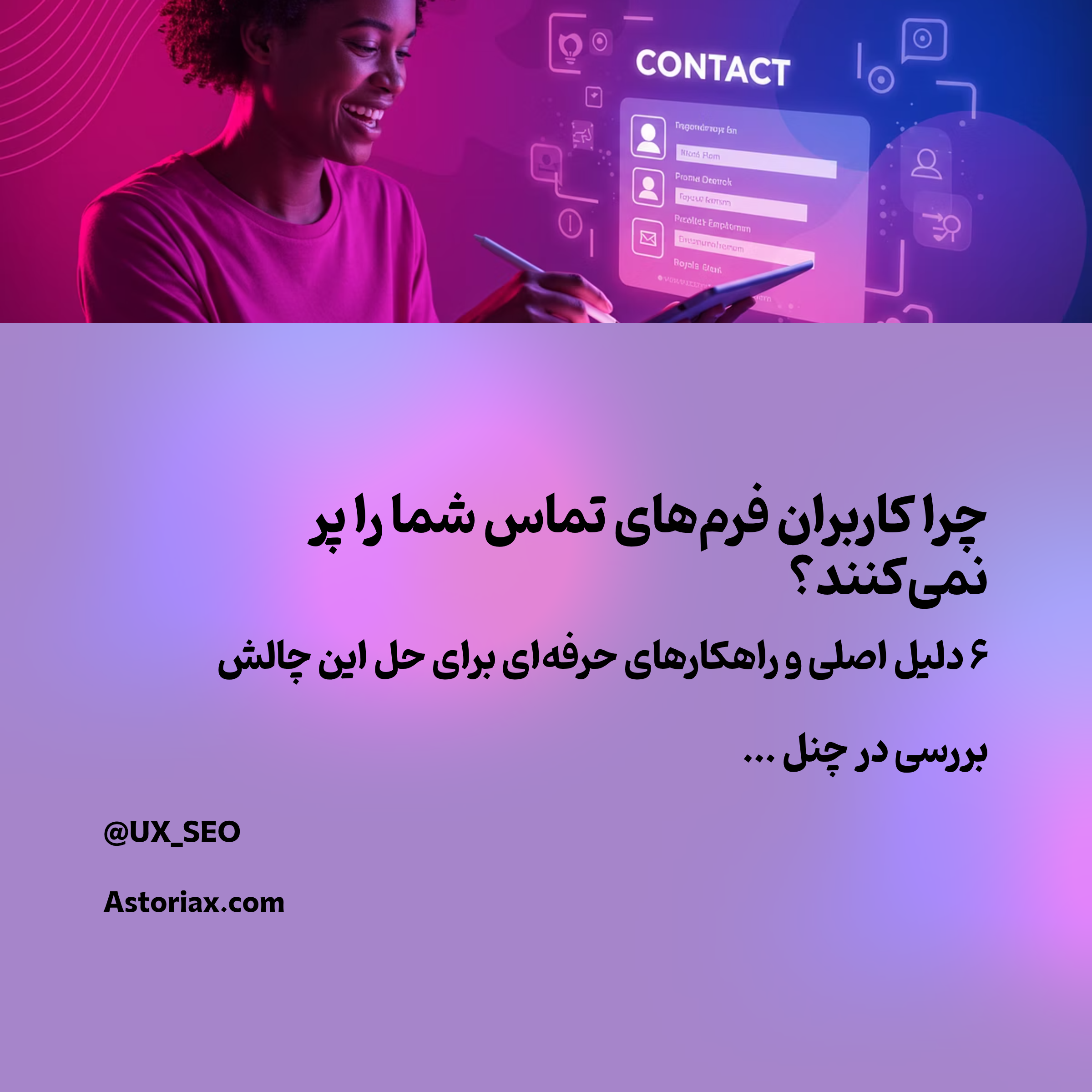 چالش شما چیست؟ شفافیت در ارائه خدمات شما میتواند کمک کند که کاربران فرمها را با آرامش خاطر پر کنند. برای دریافت مشاورههای بیشتر، به کانال تلگرام UX_SEO مراجعه کنید تا درباره استراتژیهای ارتباطی بهتر و استفاده مؤثر از فرمهای تماس بیشتر بدانید.