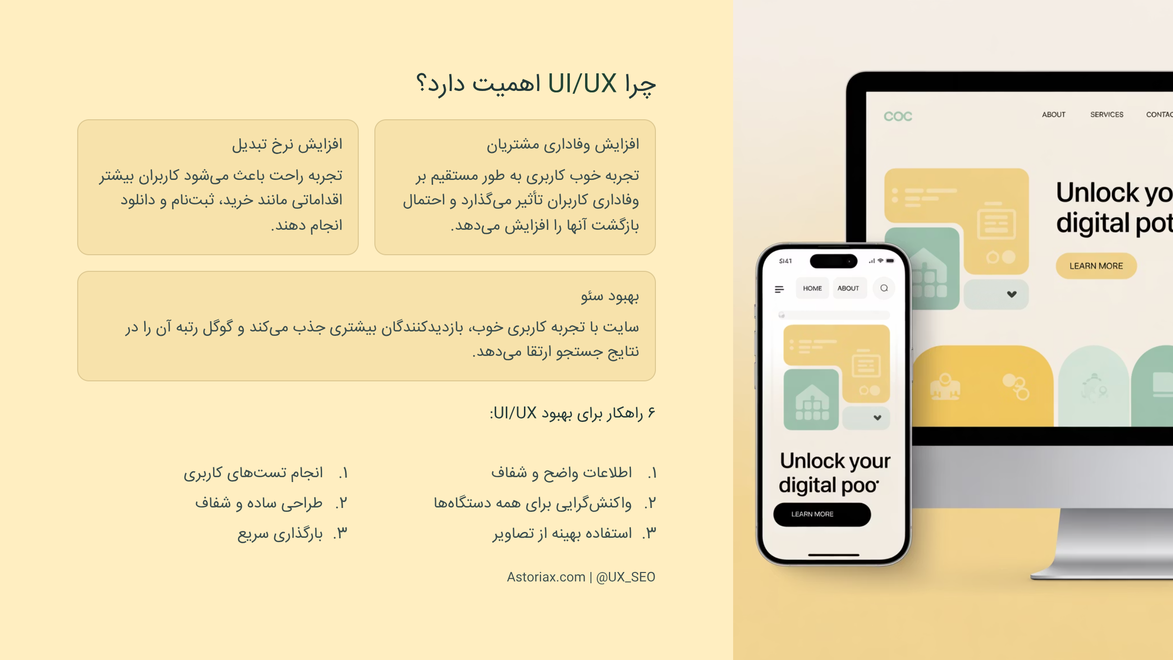 طراحی واکنشگرا: مطمئن شوید که سایت یا اپلیکیشن شما در تمامی دستگاهها، اعم از گوشیهای موبایل، تبلتها و دسکتاپها، عملکرد مناسبی دارد. این یکی از اصول اصلی UX است.