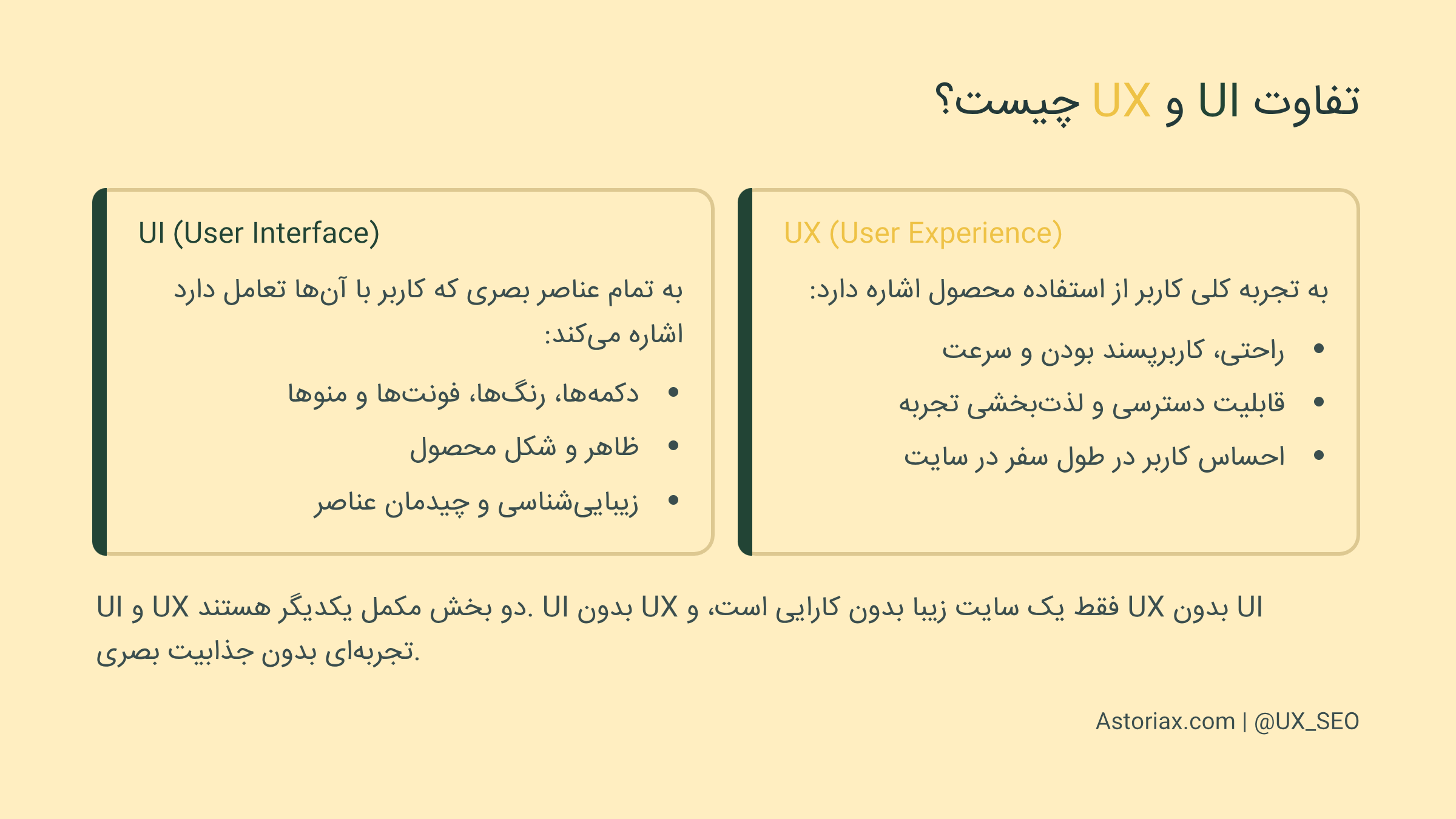 UI بیشتر به ظاهر و زیباییشناسی مربوط میشود. طراحی دکمهها، چیدمان عناصر در صفحه و رنگهای استفادهشده، همه مربوط به UI است.