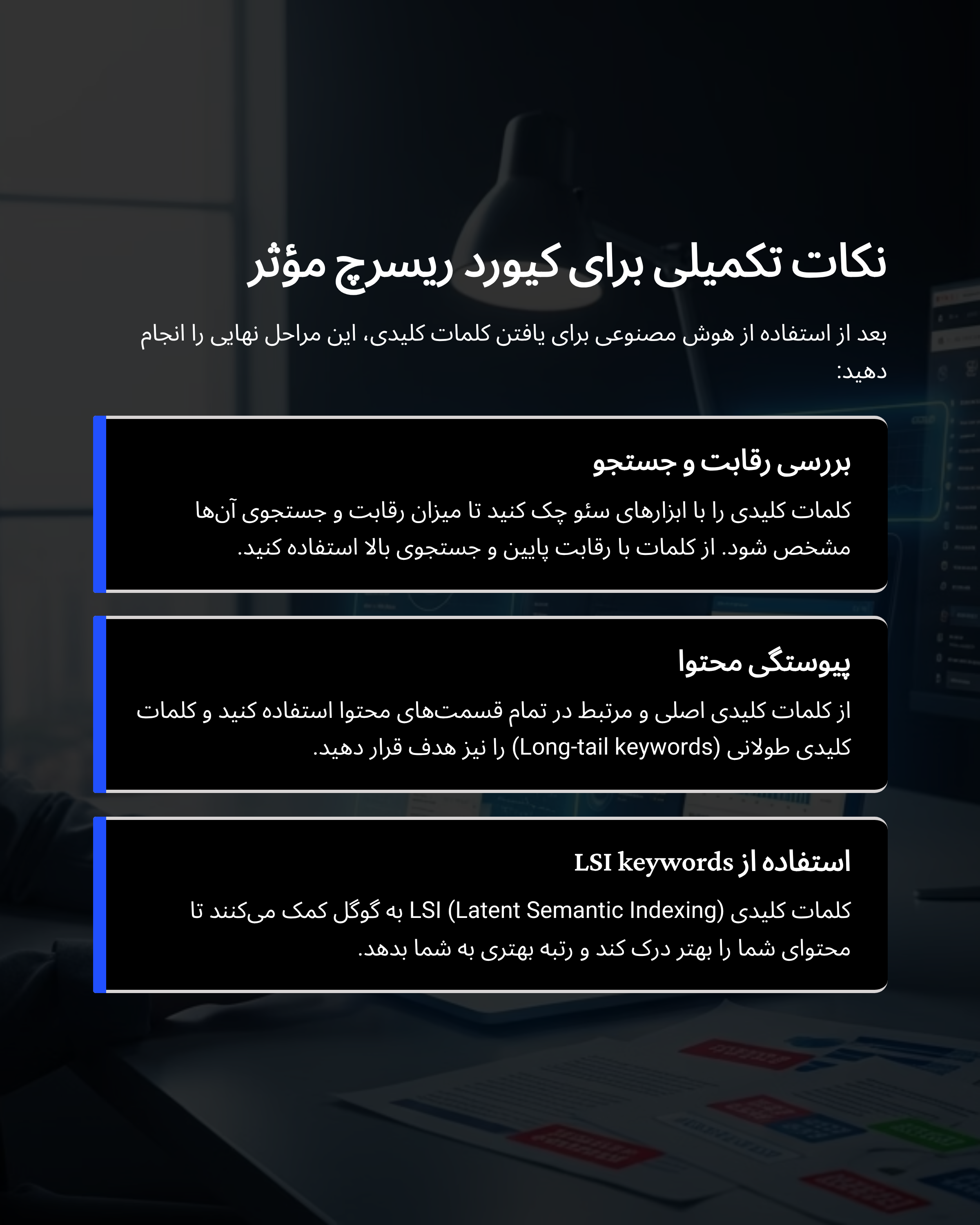 استفاده از LSI keywords: کلمات کلیدی LSI (Latent Semantic Indexing) به گوگل کمک میکنند تا محتوای شما را بهتر درک کند.