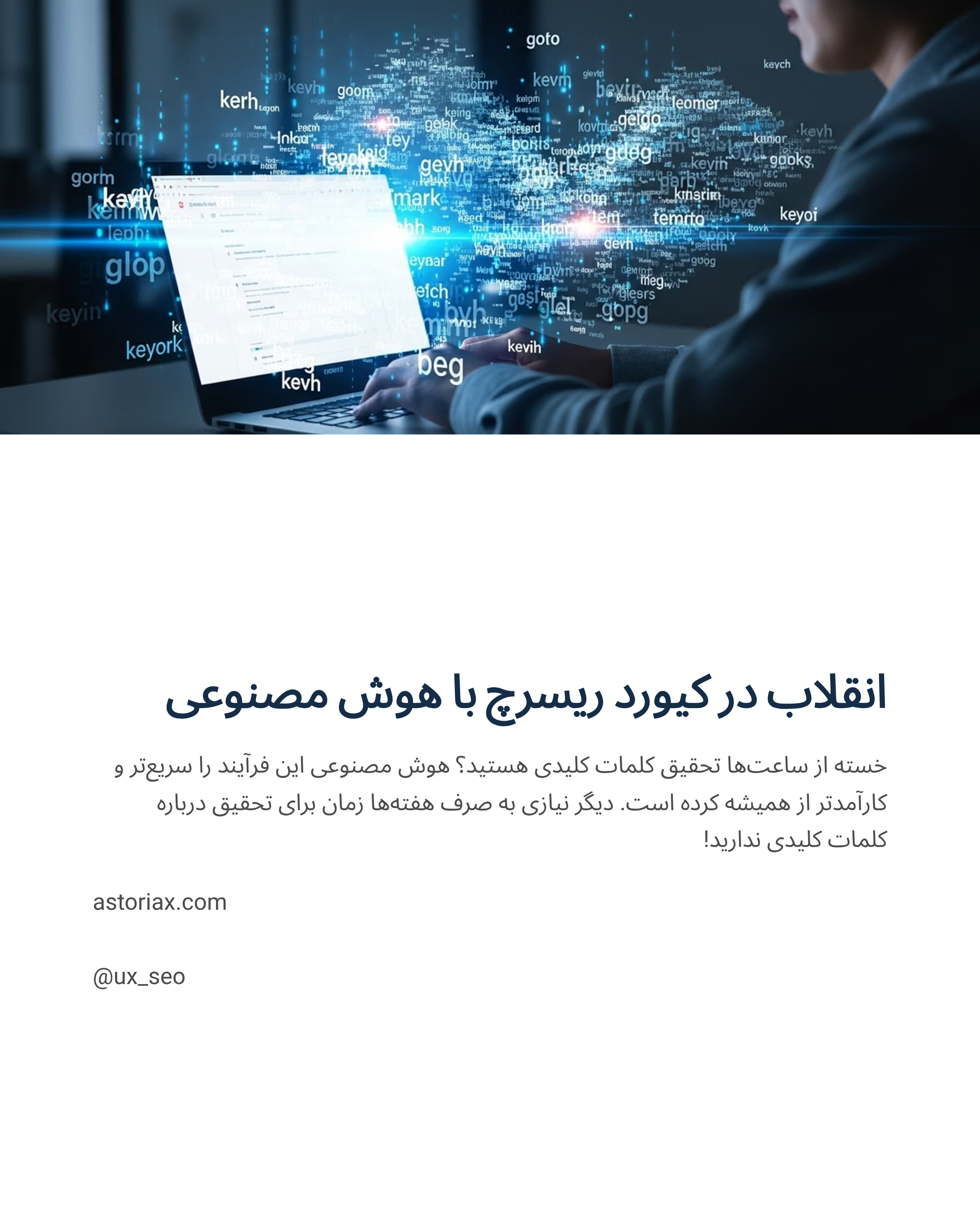 با گسترش استفاده از هوش مصنوعی در دنیای دیجیتال مارکتینگ، ابزارهای جدیدی برای تسریع و بهبود فرآیندهایی مانند کیورد ریسرچ در دسترس قرار گرفتهاند. اگر تا به حال زمان زیادی را صرف تحقیق در مورد کلمات کلیدی کردهاید، احتمالاً میدانید که این فرآیند چقدر میتواند وقتگیر باشد. اما خوشبختانه، دیگر نیازی به صرف هفتهها زمان برای تحقیق درباره کلمات کلیدی ندارید.