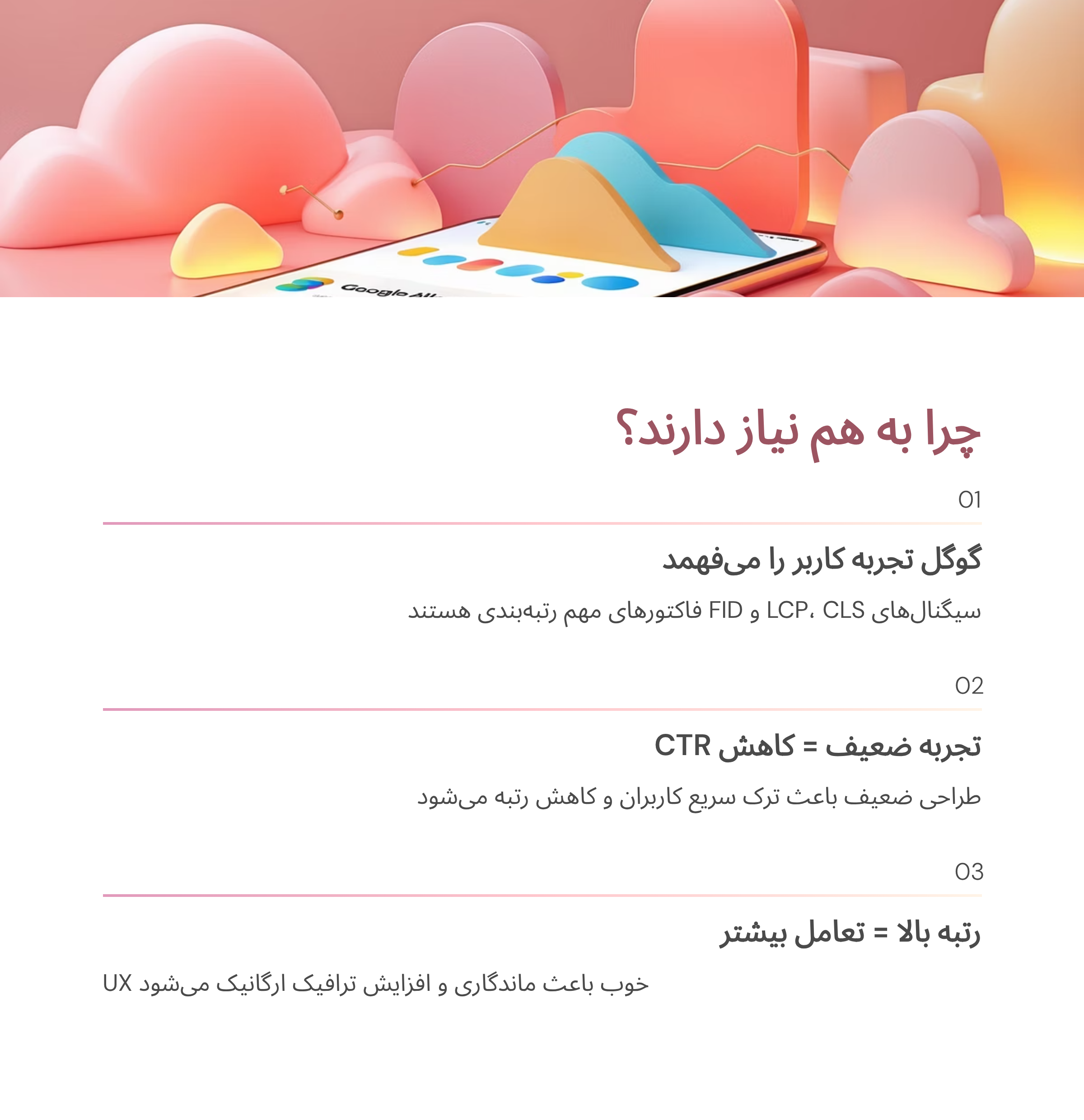 الگوریتمهای گوگل امروز دیگر به صرفاً متن و لینکها توجه ندارند. سیگنالهای تجربه کاربری مثل LCP (زمان بارگذاری بزرگترین المان صفحه)، CLS (تغییرات ناگهانی در طراحی) و FID (زمان واکنش به ورودی کاربر) از جمله فاکتورهای مهم برای رتبهبندی هستند.