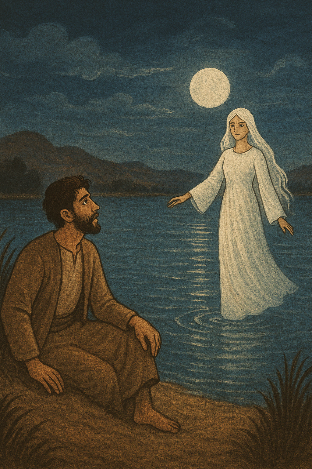 ناگهان، آب لرزید. و از میان آن آرامش، زن سپیدپوش ظاهر شد. بر آب گام میبرد، بیآنکه خیس شود. موجها از زیر پایش کنار میرفتند، گویی او نه از گِل و خون، که از خیالِ باران ساخته شده باشد.