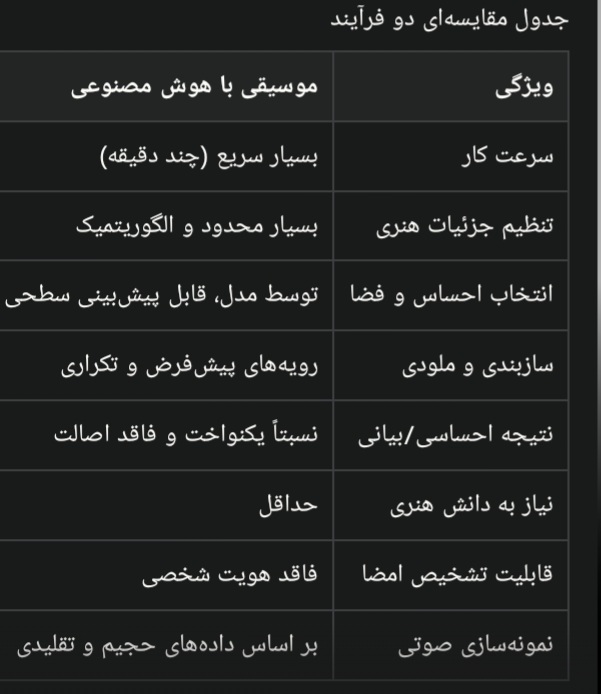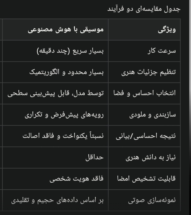 فرایندساخت سریع است و عمدتاً مبتنی بر دادههای پیشین و تقلید سبکی است تا نوآوری یا تفسیر خلاقانه.ویژگیهای ساخت موسیقی با دخالت انساندر آثار دارای دخالت انسان، هنرمند یا کارگردان هنری برای هر بیت یا بخش از شعر، تصمیم میگیرد که چه سازبندی، چه لحن و چه فضای احساسی مناسب آن روایت است.شخصیسازی و تفسیر عمیق، رنگآمیزی صوتی متناسب با محتوا، و احترام به متن و روایت شاهنامه، آثار تولیدشده با حضور انسانی را متمایز و غنیتر و زندهتر میکند.این روش زمانبر است و غالباً نیازمند صرف هفتهها کار برای هر ترک یا قطعه است، اما در نهایت انرژی و روح انسانی و هنری در خروجی کاملاً محسوس است.نتیجهدر نمایش فصل سیزدهم نرمنگاره شاهنامه، تفاوتها به صورت شنیداری و تصویری ارائه میشود تا نشان دهد نقش انسان در کارگردانی و تفسیر هنری میتواند کیفیت، تنوع و اصالت موسیقایی را در قیاس با مدلهای آماده مبتنی بر هوش مصنوعی به مراتب افزایش دهد و اثر را باورپذیر، پویا و ماندگار کند.