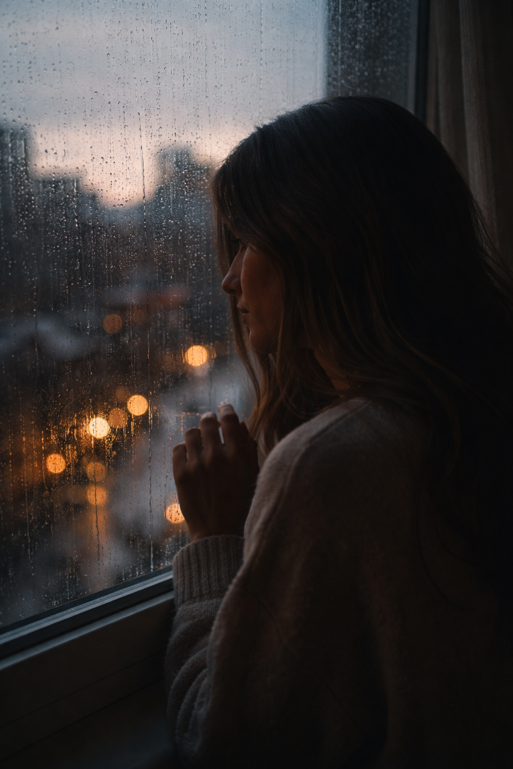 او پیشانیاش را آرام به شیشه تکیه داد.