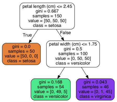 حالا ببینیم درختی که در تصویر بالا مشخص شده، چطور حدس میزنه. فرض کنید یک گل زنبق دارید و میخواید اون رو طبقهبندی کنید. از گرهی ریشه(Root Node) شروع میکنید (عمق صفر، واقع در بالای شکل): این گره میپرسه که آیا طول گلبرگ گل کوچکتر از 2.45 سانتی متر هست یا نه. اگر هست، به سمت گرهی فرزند واقع در سمت چپ حرکت میکنید (عمق یک، واقع در سمت چپ). با این شرایط، یک برگ بهحساب میاد (یعنی گرهی فرزند نداره) پس هیچ سوالی نمیپرسه و حدسی که میزنه این هست که این گل یک Iris seosa هست (class = setosa)