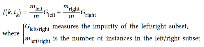 کتابخانه Scikit-Learn از الگوریتم Classification and Regression Tree برای ترین Decision Tree استفاده میکنه. روش کار این الگوریتم به این صورت هست که اول ترینینگ ست رو با استفاده از یک فیچر k و یک مرز tk (مثلا طول گلبرگ کوچکتر از 2.45 سانتی متر) به دو زیر مجموعه تقسیم میکنه. حالا چطور k و tk رو انتخاب میکنه؟ در واقع به دنبال جفت (k, tk) ای میگرده که خالص ترین زیرمجموعه رو تولید میکنه. معادلهی زیر تابع هزینهی این الگوریتم رو نشون میده.