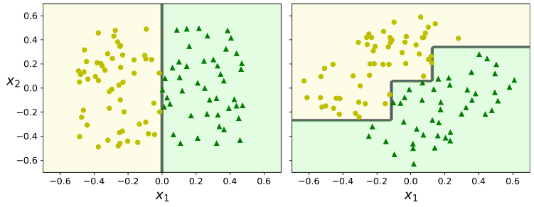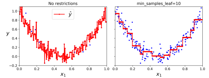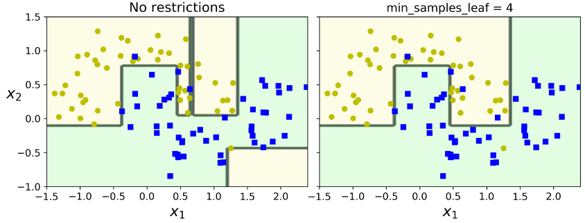 تصویر زیر دو درخت تصمیم رو نشون میده که روی دیتاست moon ترین شده. در سمت چپ مدل با هایپرپارامترهای دیفالت درست شده (بدون Regularization) و در سمت راست با استفاده از min_samples_leaf=4. مشخصه که مدل سمت چپ اورفیت شده و مدل سمت راست بهتر عمومیسازی میکنه.