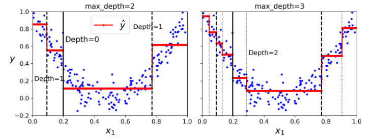 حدسهایی که مدل زده در شکل مشخص شدند. اگر max_depth=3 باشه، شکل سمت راست نسیبتون میشه. دقت کنید که مقدار حدس زده شده برای هر منطقه همیشه برابر میانگین مقادیر حدس زده شدهی نمونههای اون منطقه هست. الگوریتم هر منطقه رو جوری بخش بندی میکنه که بیشتر نمونههای آموزش رو تا حد ممکن به مقدار پیش بینی شده نزدیک کنه.