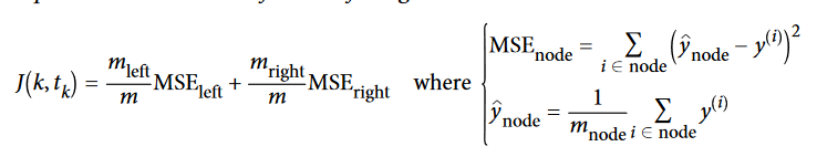 الگوریتم CART بهجای اینکه بیاد ترینینگ ست رو طوری تقسیم کنه که ناخالصی رو کاهش بده، تلاش میکنه که ترینینگ ست رو طوری تقسیم کنه که MSE کاهش پیدا کنه. تابع هزینه رو میتونید ببینید: