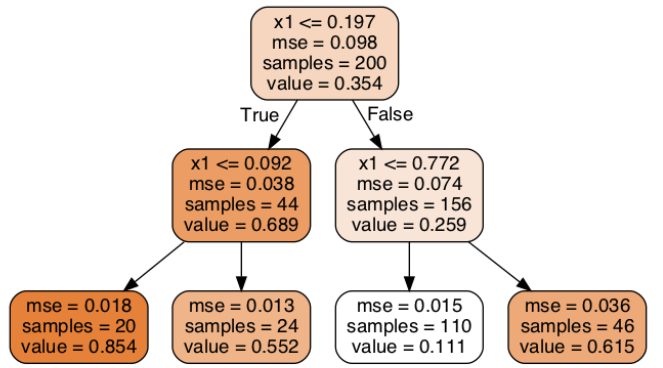 این درخت شبیه درختی هست که برای طبقهبندی درست کردیم. اصلیترین تفاوت در این هست که بهجای اینکه در هر ریشه یک کلاس حدس بزنه، یک مقدار حدس میزنه. برای مثال، فرض کنید میخوایم یک حدس برای نمونهای با x1=0.6 انجام بدیم. از ریشهی درخت شروع میکنیم و در نهایت مقدار value=0.111 رو حدس میزنیم. این مقدار در واقع میانگین مقادیر حدس زده شده برای 110 نمونه ترینینگ هست که توی این ریشهی برگ وجود دارند و نتیجهی اون mean squarred error برابر 0.015 هست.