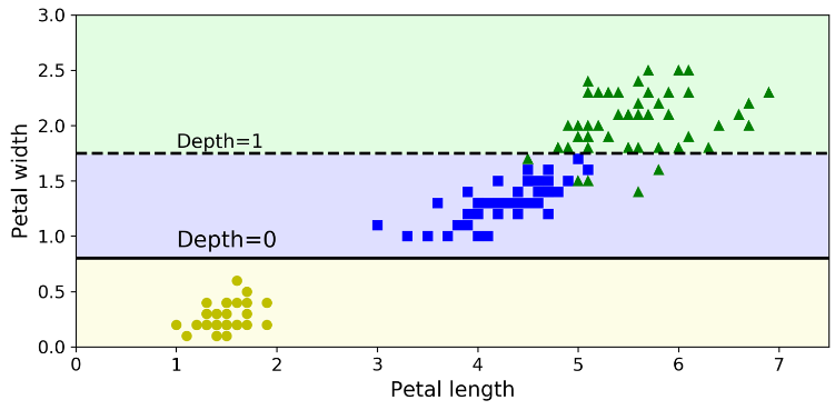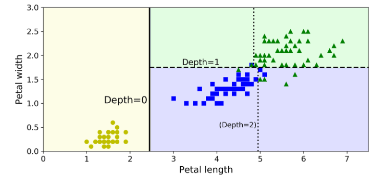 شکل زیر مرزهای تصمیمگیری درخت تصمیم رو نشون میده.خط عمودی زخیم نشون دهنده مرز تصمیم گرهی ریشه واقع در عمق صفر هست: طول گلبرگ برابر 2.45 سانتی متر. از اونجایی که قسمت سمت چپ خالص هست (فقط شامل نمونههای iris setosa هست)، بیشتر از این نمیشه اون رو جدا کرد. اما قسمت سمت راست ناخالصی داره در نتیجه عمق 1 در عرض گلبرگ برابر 1.75 سانتی متر جدا میشه (با خط بریده بریده نشون داده شده). از اونجایی که خودمون max_depth رو برابر 2 قرار دادیم، درخت تصمیم همینجا متوقف میشه. اگر اون رو برابر 3 قرار میدادیم یک مرز تصمیم دیگه هم اضافه میشد (با خط نقطه نقطه نشون داده شده)