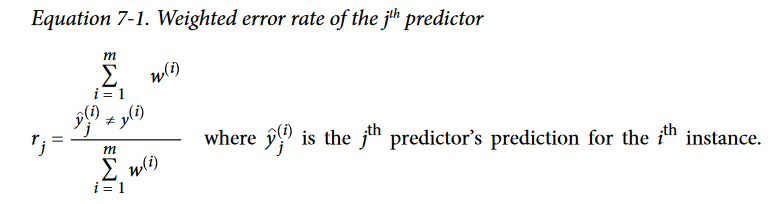 بیاید یک نگاه نزدیکتر به الگوریتم AdaBoost بندازیم.در ابتدا، وزن هر نمونه ( (i)^w ) برابر 1-^(m) هست. اولین Predictor آموزش میبینه و نرخ خطای وزن دار اون ( r_1 ) بر روی ترینینگ ست محاسبه میشه: