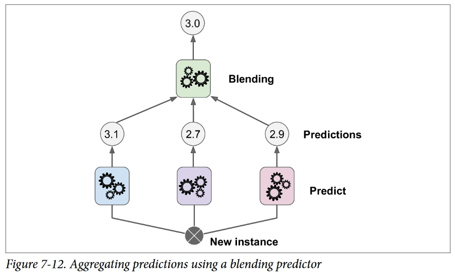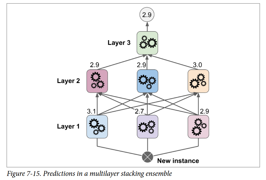 آخرین روش Ensemble که توی این فصل میخوایم بررسی کنیم، Stacking نام داره (کوتاه شدهی Stacked Generalization). این روش برپایهی یک ایدهی ساده هست: بهجای استفاده از تابعهای اضافهای (مثل Hard Voting) برای تجمیع پیشبینی همهی Predictorها در یک Ensemble ، چرا یک مدل آموزش ندیم که این تجمیع رو انجام بده؟ شکلی که در پایین میبینید یک همچین Ensemble رو نشون میده که یک عملیات رگرسیون رو بر روی یک نمونهی جدید انجام میده. هر کدوم از سه Predictor پایین یک مقدار متفاوت رو پیشبینی میکنه (3.1و 2.7 و 2.9) و Predictor نهایی (به نام Blender یا Meta Learner) این پیشبینیهارو بهعنوان ورودی میگیره و پیشبینی نهایی رو انجام میده (3.0)