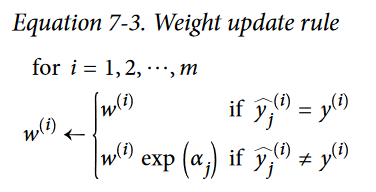 این الگوریتم در قدم بعدی وزن نمونههارو بهروزرسانی میکنه. فرمول زیر وزن نمونههای اشتباهطبقهبندیشده رو بهروزرسانی میکنه: