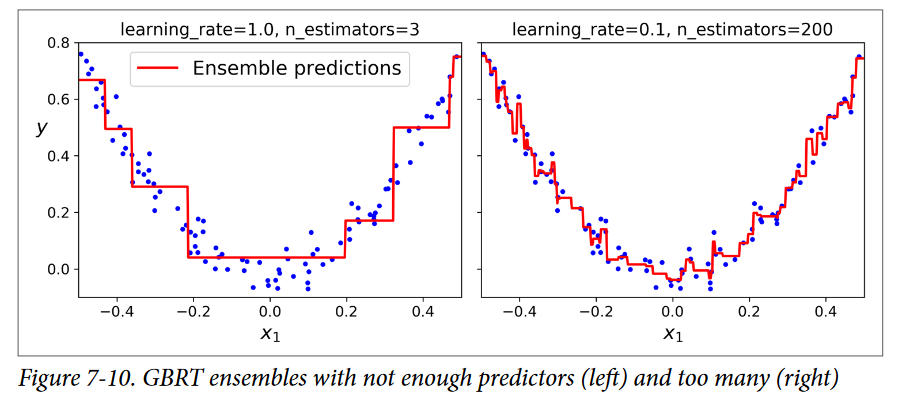 هایپرپارامتر learning_rate میزان مشارکت هر درخت رو مقیاسبندی میکنه. اگر اون رو برابر یک مقدار کم مثل 0.1 قرار بدید، به درختهای بیشتری در Ensemble احتیاج خواهیم داشت تا روی ترینینگ ست فیت بشه اما معمولا در این حالت پیشبینیها بهتر عمومیسازی میشن. این تکنیک Regularization میگن Shrinkage. شکل پایین دو GBRT Ensemble رو نشون میده که Learning Rate توی اونها کم هست. مدل سمت چپ تعداد درختهای کافی نداره تا روی ترینینگ ست فیت بشه در حالیکه مدل سمت راست تعداد درختهای زیادی داره و ترینینگ ست رو اورفیت میکنه.