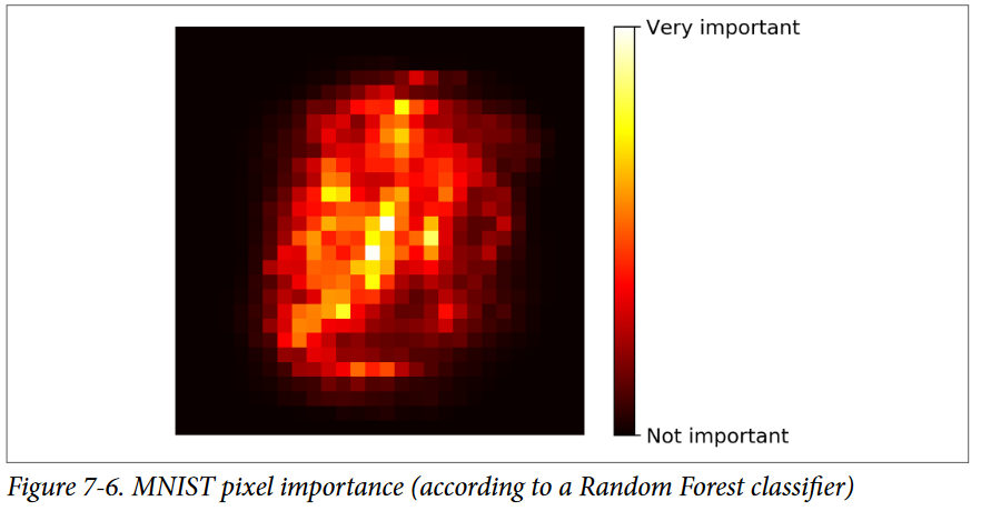 بهطور مشابه، اگر یک Random Forest روی دیتاست MNIST آموزش بدید و اهمیت هر پیکسل رو با نمودار نشون بدید، با این شکل روبرو میشید:
